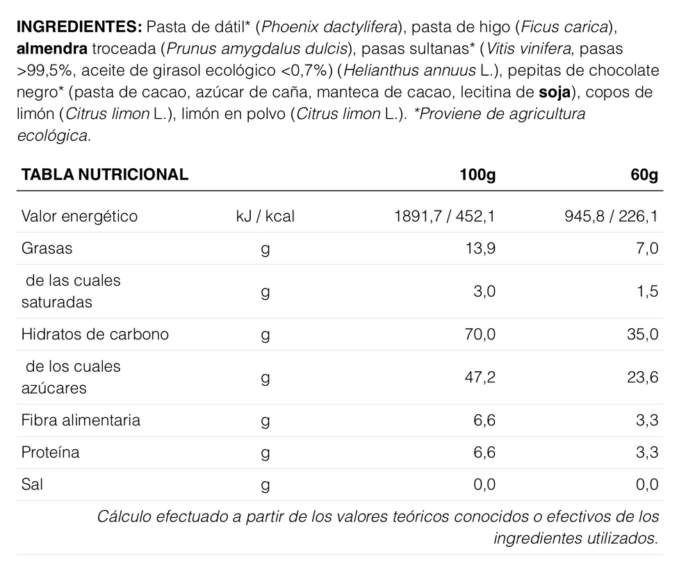 Barrita energética rica en hidratos de carbono a base de frutas desecadas, frutos secos y pepitas de chocolate, sin gluten y aptas para vegetarianos, formuladas únicamente con ingredientes naturales como el dátil, el higo, las pasas y las almendras sin ningún tipo de azúcar añadido, ni siropes.