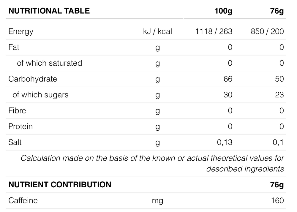 Gel energético CON CAFEÍNA, SABOR CEREZA. Gel a base de hidratos de carbono (50g), Ciclodextrina y aroma natural. Contiene cafeína (160 mg/76 g). No recomendado para niños ni mujeres embarazadas.