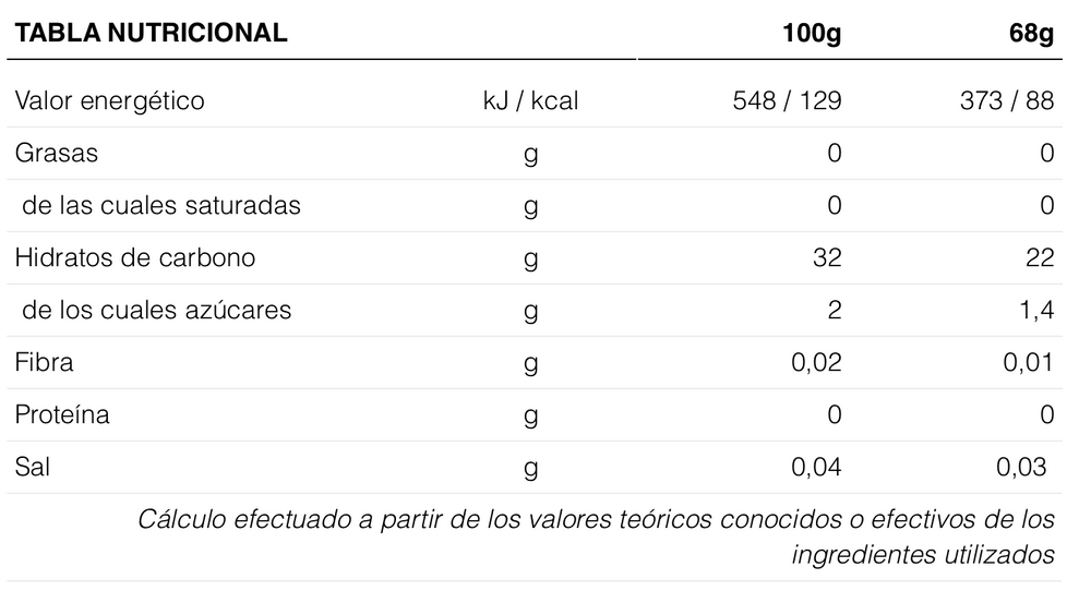 En formato stick de 68 g y con 89 kcal, contiene 22 g de carbohidratos por gel de los cuales prácticamente su totalidad son hidratos complejos y solo 1,4 g de azúcar.