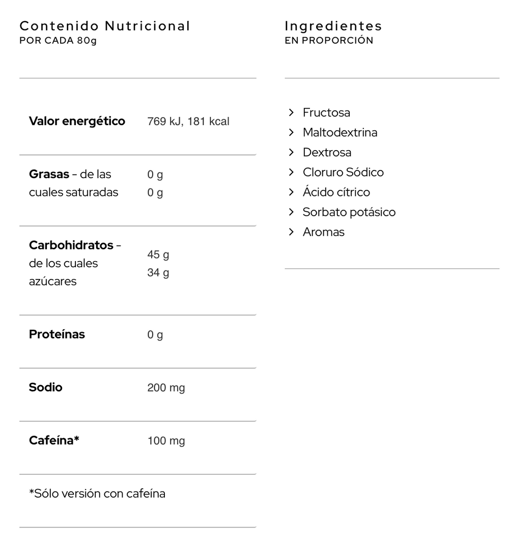 UNUSUAL GEL 45CHO incorpora una formulación centrada en el RATIO 1:1, igualando la carga de trabajo de SGLT1, SGLT2 y GLUT 5, las dos puertas intestinales de entrada a la sangre. Con esto conseguimos una eficacia máxima en esa absorción y metabolización del hidrato de carbono, siendo idónea para estrategias nutricionales de 90 o más gramos de hidratos de carbono a la hora.