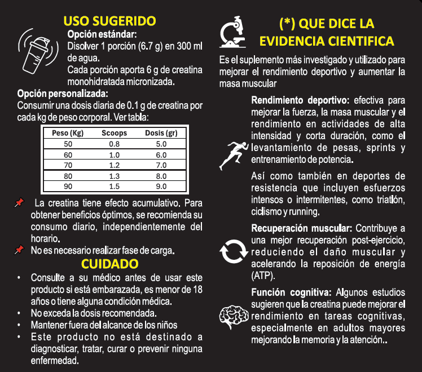 • 6 gramos reales de creatina monohidratada micronizada por servicio de 6.7 g.