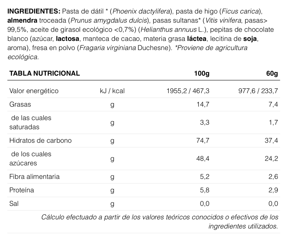 Barrita energética rica en hidratos de carbono a base de frutas desecadas, frutos secos y pepitas de chocolate, sin gluten y aptas para vegetarianos, formuladas únicamente con ingredientes naturales como el dátil, el higo, las pasas y las almendras sin ningún tipo de azúcar añadido, ni siropes.